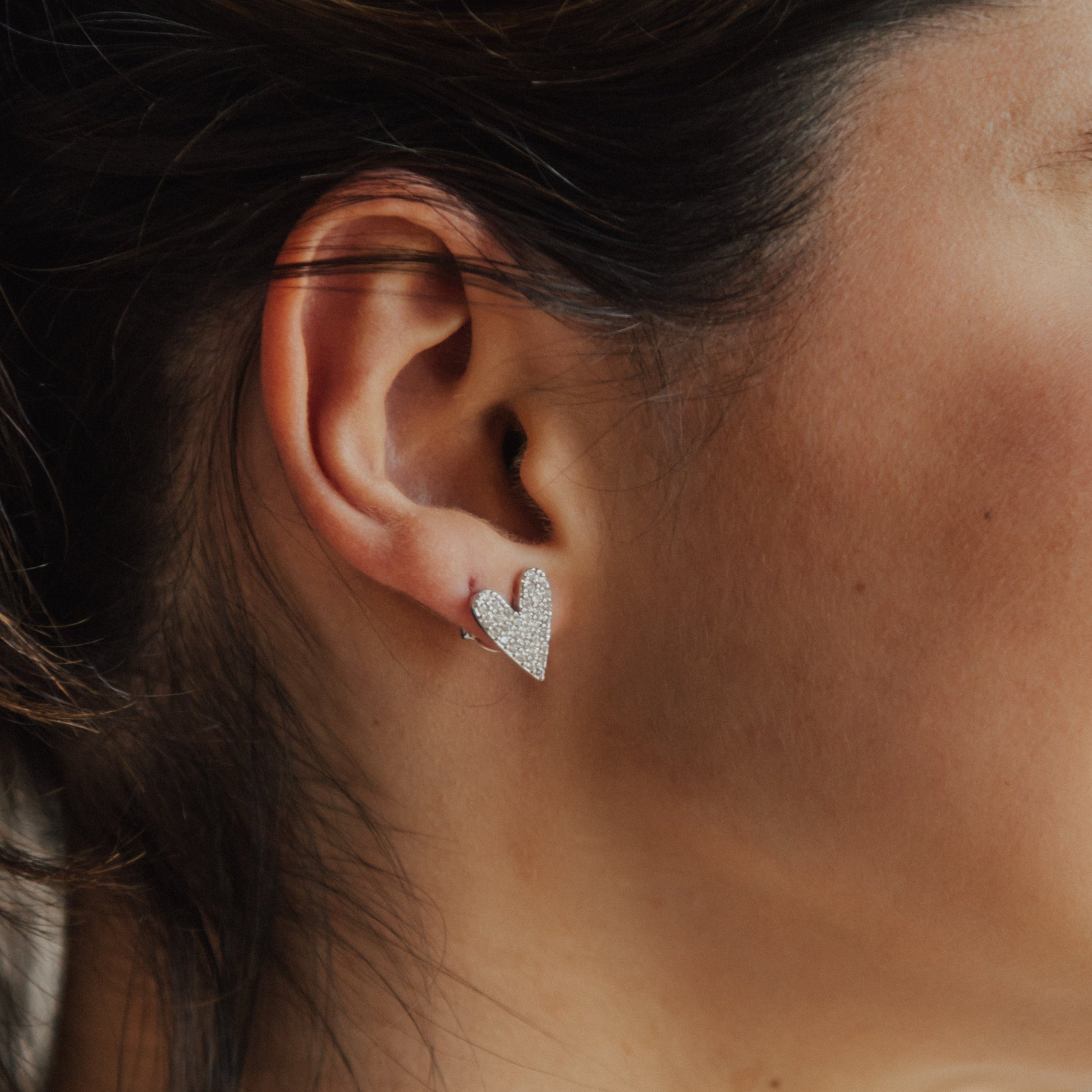 Brinco de coração cravejado prateado. Esse é pra quem quer um brinco para todas as horas, que combina com tudo, mas tem o charme de ter o formato de coração.