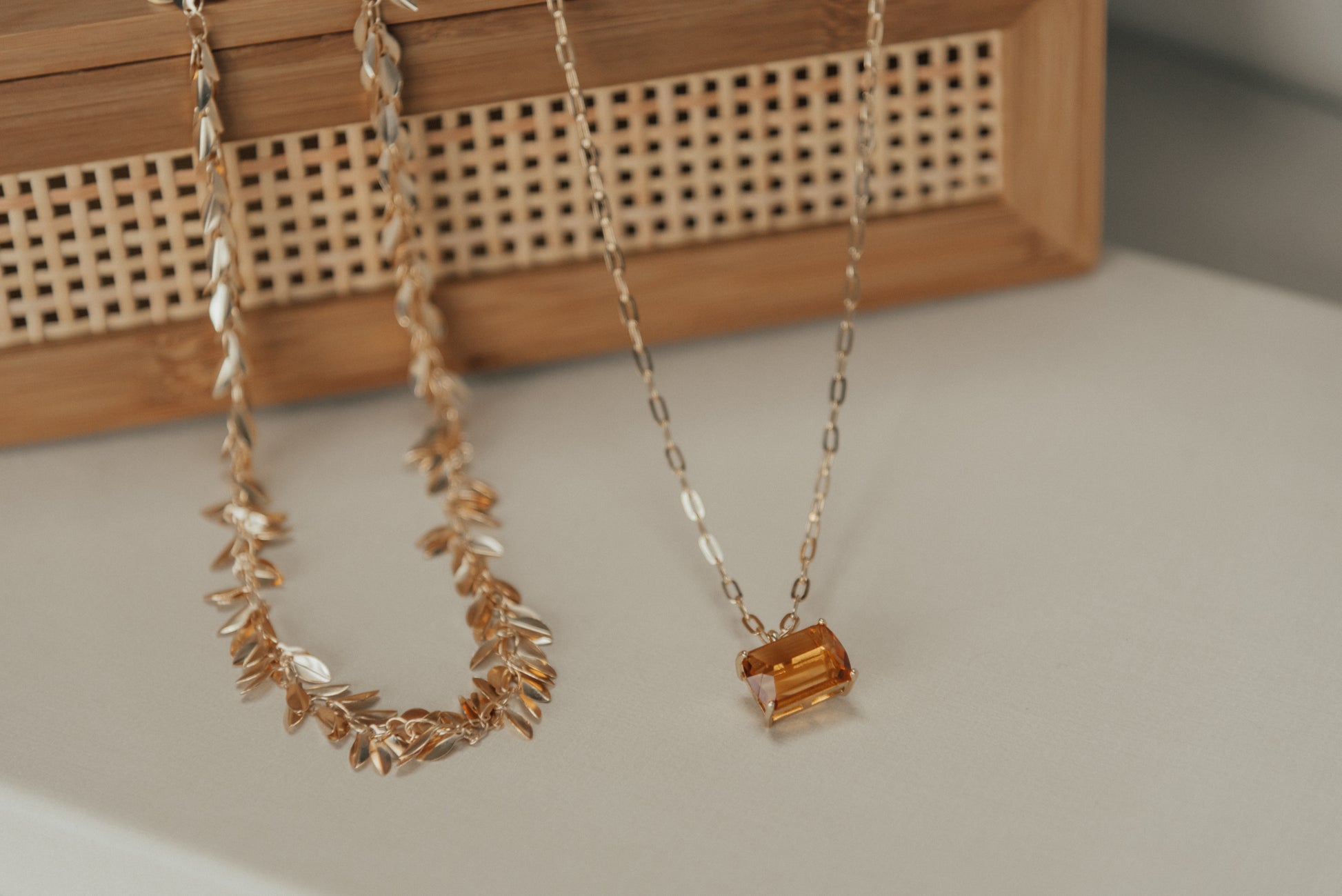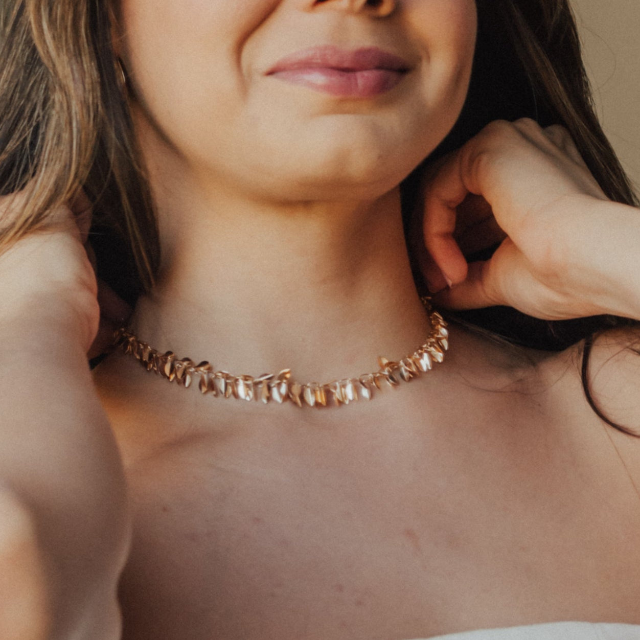 gargantilha de folhinhas douradas, com muito movimento do jeito que a gente gosta!